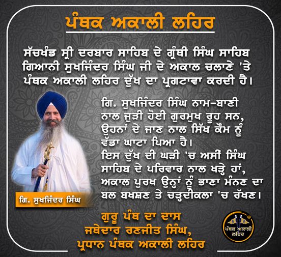 News and media ਅਕਾਲ ਚਲਾਣਾ ਗ੍ਰੰਥੀ ਸਿੰਘ ਸਾਹਿਬ ਗਿਆਨੀ ਸੁਖਜਿੰਦਰ ਸਿੰਘ ਜੀ October 8, 2020October 15, 2020 admin_pkhalsa Share Post Whatsapp Email Print