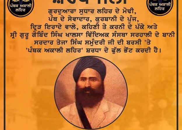 ਗੁਰਦੁਆਰਾ ਸੁਧਾਰ ਲਹਿਰ ਦੇ ਮੋਢੀ, ਪੰਥ ਦੇ ਸੇਵਾਦਾਰ, ਕੁਰਬਾਨੀ ਦੇ ਪੁੰਜ, ਦ੍ਰਿੜ ਇਰਾਦੇ ਵਾਲੇ, ਕਹਿਣੀ ਤੇ ਕਰਨੀ ਦੇ ਪੱਕੇ ਅਤੇ ਸ੍ਰੀ ਗੁਰੂ ਗੋਬਿੰਦ ਸਿੰਘ ਖਾਲਸਾ ਵਿੱਦਿਅਕ ਸੰਸਥਾ ਸਰਹਾਲੀ ਦੇ ਬਾਨੀ ਸਰਦਾਰ ਤੇਜਾ ਸਿੰਘ ਸਮੁੰਦਰੀ ਜੀ ਦੀ ਬਰਸੀ ‘ਤੇ ‘ਪੰਥਕ ਅਕਾਲੀ ਲਹਿਰ’ ਸ਼ਰਧਾ ਦੇ ਫੁੱਲ ਭੇਂਟ ਕਰਦੀ ਹੈ।